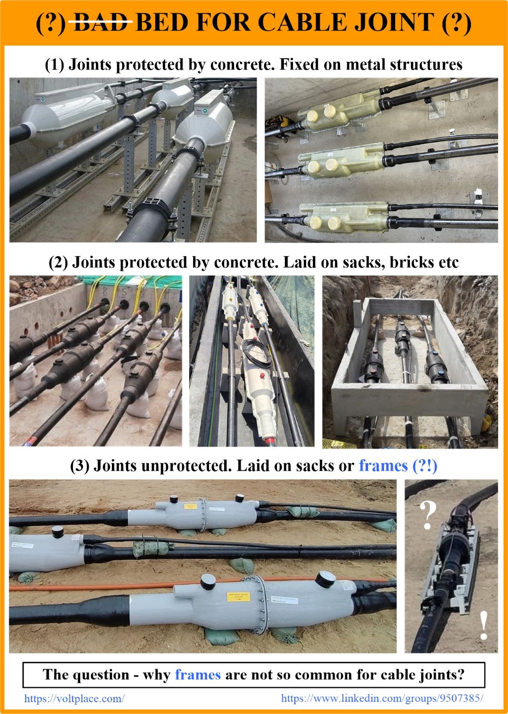 The frame seems to be a good way to provide a flat base for the cable joint and a horizontal cable entry into the joint. I wonder why mounting frames are almost not found on MV-HV cable lines?