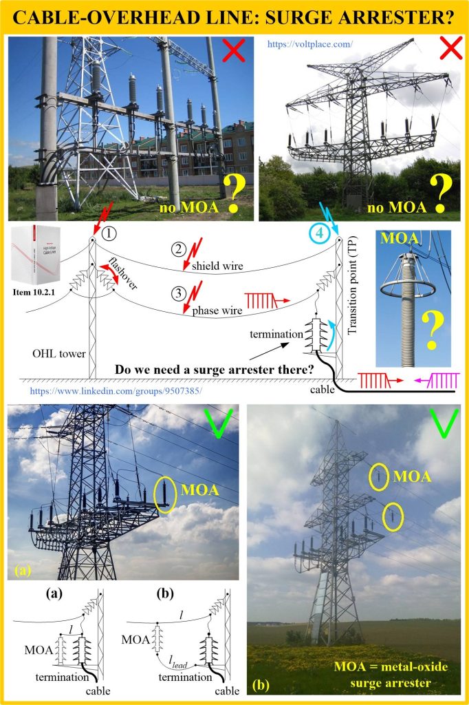 Transition points without MOAs are not someone’s fault, but they are found all over the world. For example, the main regulatory document of the former USSR (Rules for electrical installations “PUE”) directly contains provisions that, for mixed lines, there is no need for MOA at the ends of cable section if its length exceeds 1.5 km. I have also personally encountered 115 and 230 kV transition points without MOA in countries such as Italy and Germany (I do not know the exact length of cable sections there, but it was clearly at least 500 m). Hence the question arises – where could the idea not to put MOA at the transition point come from?