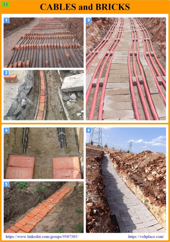4️⃣-5️⃣-6️⃣ Mechanical protection of the cables (basically, bricks help protect the cables only from above). It starts working after the completion of the cable laying, and trench backfilling.